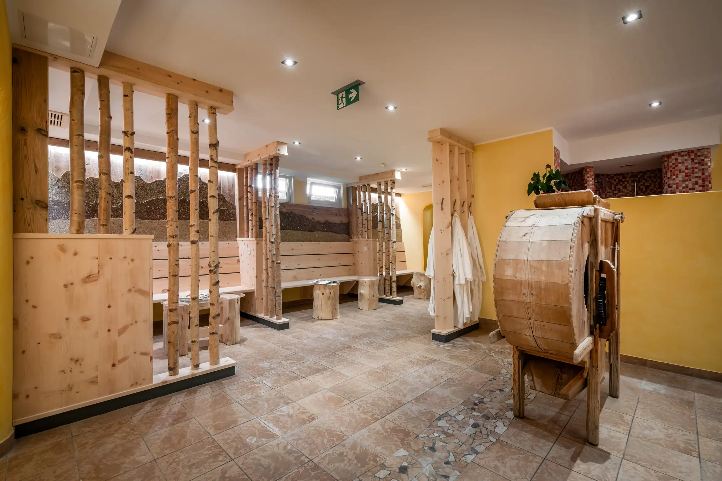Unsere Saunalandschaft mit Finnische Sauna, Kräuter-Sauna (Sanarium) und Wärmebank stehen Ihnen zur Verfügung. Zur Abkühlung wird der Ausgang ins Freie ermöglicht.