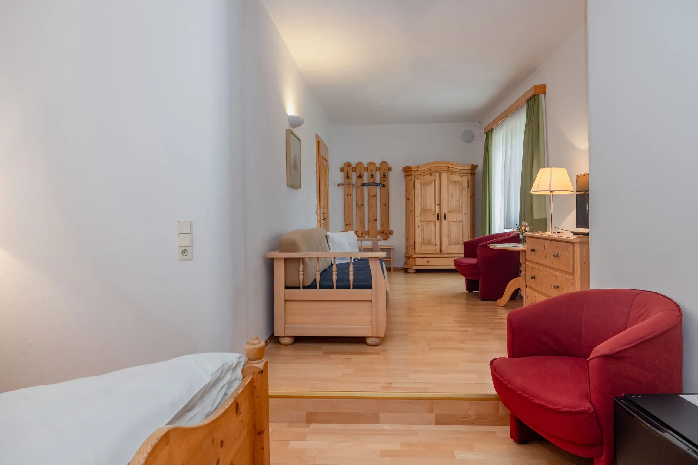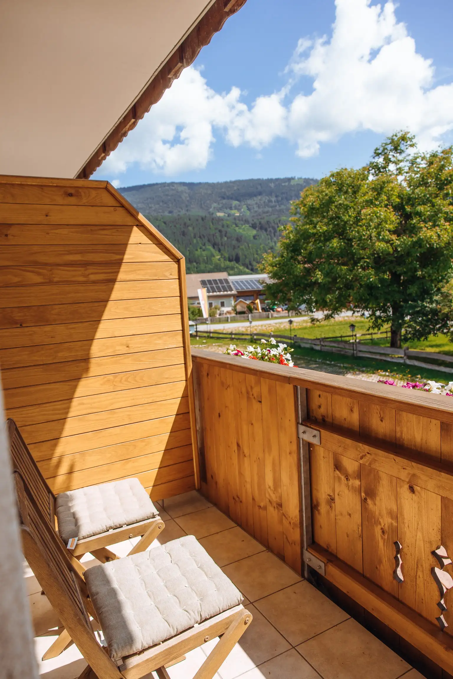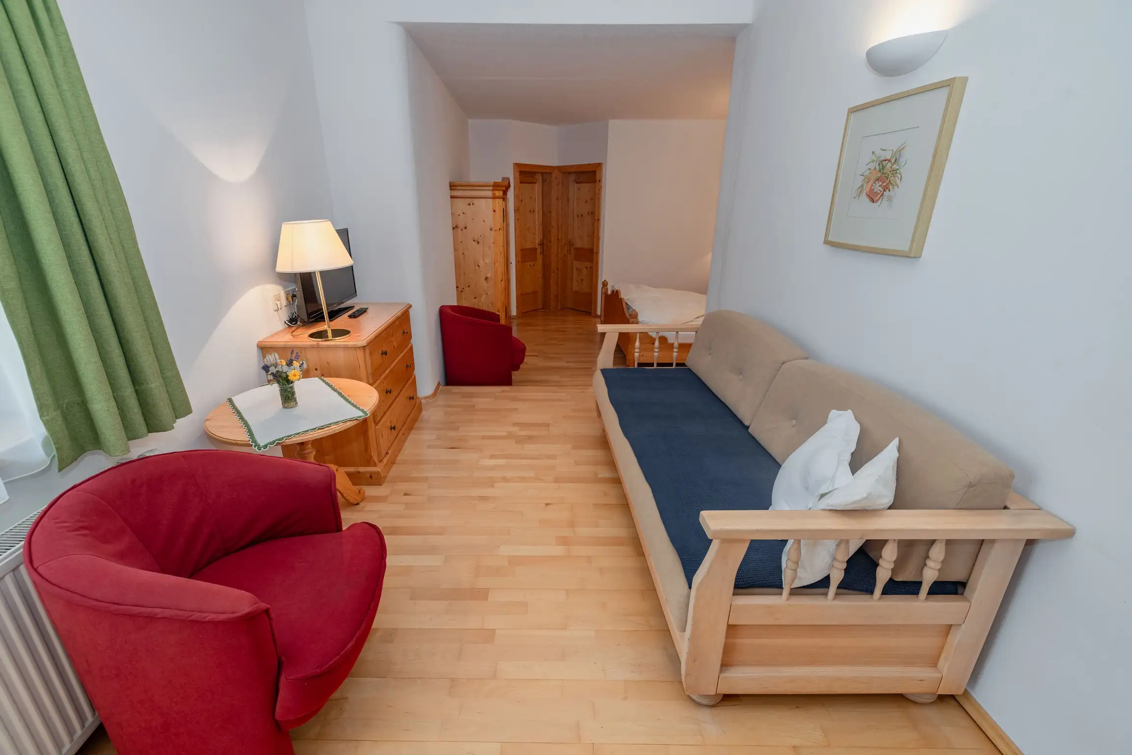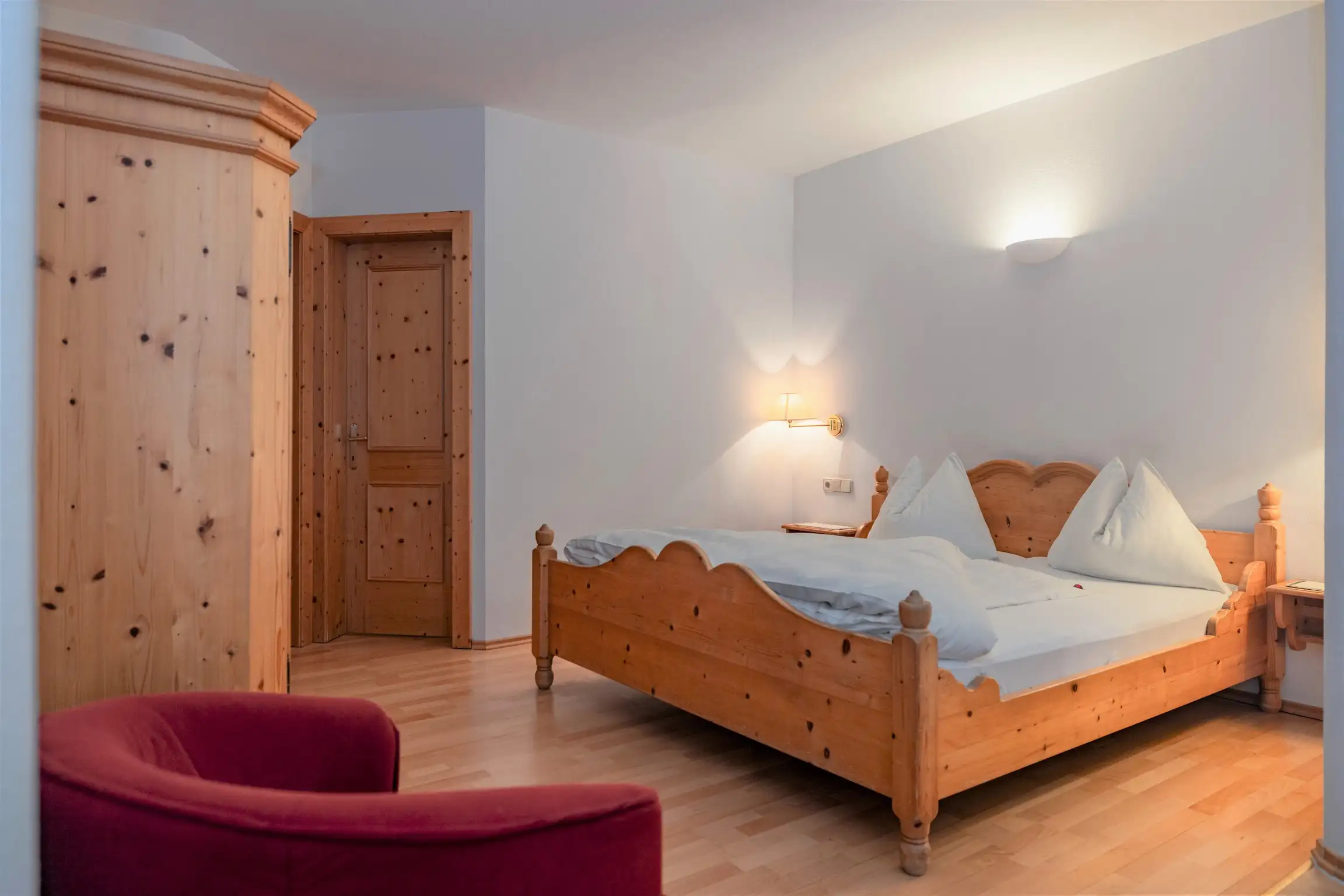 ca. 30 m² + Balkon ostseitig mit Blick zum Dorf, großzügiger Schlaf- und Wohnbereich, Minikühlschrank, Sat-TV, Safe, Bad mit Kosmetikspiegel, Kosmetikartikel und Haarföhn, WC separat.
